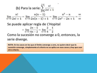 Este documento trata sobre series infinitas. Explica que una serie infinita es la suma de los términos de una sucesión infinita. Para que una serie sea convergente, la suma parcial debe converger a un valor límite cuando n tiende a infinito. Presenta diferentes tipos de series como la armónica y geométrica, y criterios para determinar si una serie es convergente o divergente como el del término general, integral y de la razón.