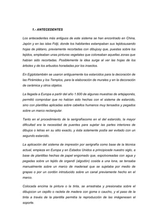 Este documento describe el proceso de serigrafía, incluyendo sus orígenes, características y etapas. La serigrafía permite imprimir sobre diversos materiales usando una matriz con una malla que permite el paso de tinta. El proceso involucra la creación de una película, matriz y luego la impresión. La serigrafía ofrece muchas ventajas como imprimir en variados soportes y formas con colores vibrantes.
