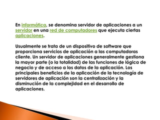 Un servidor de aplicaciones es un servidor de software que ejecuta aplicaciones y proporciona servicios a computadoras cliente, manejando funciones de negocio y acceso a datos. Los principales beneficios son la centralización y reducción de complejidad. Los servidores de aplicaciones Java EE como WebSphere, WebLogic, JOnAS y JBoss ejecutan componentes como servlets, JSPs y EJBs. Otros servidores de aplicación incluyen Microsoft IIS y servidores de código abierto como Base4 y Zope.