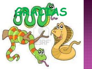 El documento describe las características físicas y habilidades de locomoción de las serpientes. Carecen de extremidades pero tienen más de 400 vértebras que les permiten moverse de forma flexible a través de espacios estrechos. Se mencionan cuatro tipos de movimiento serpentino, rectilíneo, acordeón y descotado.