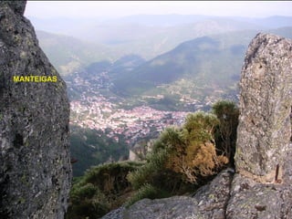 Este documento menciona varias características y lugares notables de la Sierra de Estrela en Portugal, incluyendo Manteigas, el Poço do Inferno, el Valle Glaciar, la Fuente Paulo Pires, Covão da Ametade, los Cântaros, los Piornos, la Nave de Sa António, el Túnel, la Torre Panorámica, el Marco Geodésico, los Perros de la Sierra de Estrela, el Lago Viriato, el Refugio de Pastores y la Piedra del Oso.