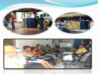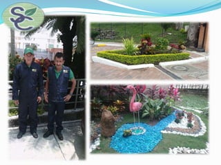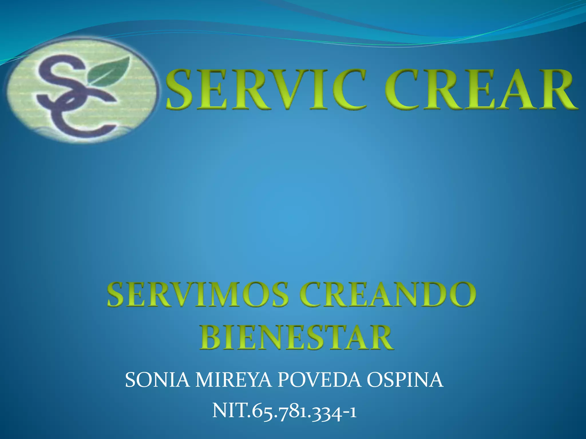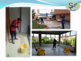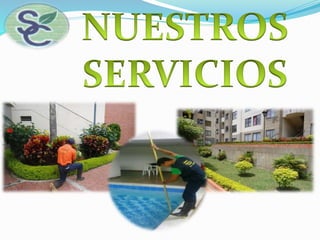 El documento presenta la misión, visión y servicios ofrecidos por SERVIC CREAR, una empresa dedicada a prestar servicios de limpieza, mantenimiento de jardines y piscinas, y actividades recreativas. La misión es ofrecer un excelente servicio con personal calificado para satisfacer a los clientes. La visión es mejorar continuamente para ampliar la cobertura a nivel regional y nacional. Los servicios incluyen limpieza, jardinería, control de plagas, salvamento acuático y más.