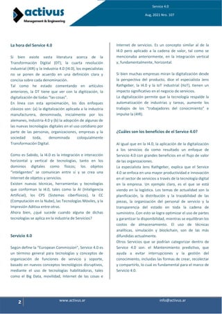 El documento habla sobre el concepto de Service 4.0, el cual se refiere a la aplicación de tecnologías disruptivas como Big Data, movilidad, Internet de las Cosas e Internet de Servicios a la cadena de valor de los servicios de forma similar a como la Industria 4.0 lo hace con la industria manufacturera. Algunos beneficios del Service 4.0 incluyen mayor productividad e innovación en el sector de servicios a través del uso de tecnología digital. El futuro de los servicios se dirige hacia servicios integrados, sin fricciones,