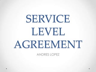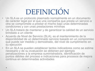 Un SLA es un acuerdo legal entre una empresa que presta un servicio y un cliente, en el que se establecen las condiciones del servicio y las métricas mínimas que debe cumplir. Un SLA busca garantizar la calidad del servicio mediante indicadores medibles y objetivos de cumplimiento. Debe contener las necesidades de los usuarios, los recursos asignados, los alcances y exclusiones del servicio, así como las responsabilidades de ambas partes.