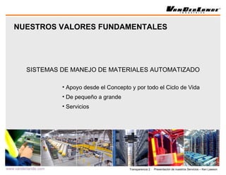 Vanderlande Industries es una compañía con más de 60 años de experiencia en sistemas de manejo de materiales automatizados. Tiene presencia mundial en más de 90 países y ofrece una variedad de servicios como manejo de equipaje, distribución de paquetes y logística postal. Sus servicios incluyen diseño, construcción, instalación, fabricación, mantenimiento y soporte técnico para sus sistemas de manejo de equipaje en aeropuertos de todo el mundo.