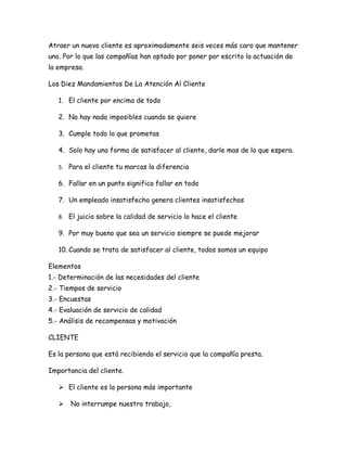 Este documento describe el servicio al cliente y su importancia. Explica que el servicio al cliente implica proporcionar al cliente el producto en el momento y lugar adecuados para un uso correcto. También destaca que un buen servicio al cliente puede ser tan efectivo para las ventas como los descuentos o la publicidad. Además, resalta que retener a los clientes existentes cuesta menos que ganar nuevos clientes.
