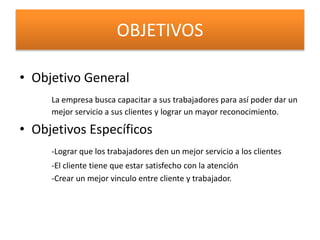El documento describe los objetivos de capacitar a los trabajadores de una empresa para mejorar el servicio al cliente. Los objetivos generales son mejorar el servicio al cliente y lograr un mayor reconocimiento de la empresa. Los objetivos específicos son dar un mejor servicio, satisfacer al cliente, y crear un mejor vínculo entre cliente y trabajador. El documento también discute conceptos como servicio al cliente, expectativas del cliente, y tipos de servicio.