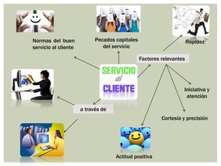 Este documento describe los aspectos fundamentales del buen servicio al cliente, incluyendo las normas, tipos y pecados capitales del servicio. Explica que un servicio satisface las necesidades de los clientes a través de la interacción entre empleados y clientes. Un buen servicio hace que los clientes regresen y recomienden a la empresa. El servicio debe mostrar actitud positiva, rapidez, cortesía, precisión y atención. Los pecados capitales incluyen apatía e indiferencia. El servicio al cliente es fundamental para retener clientes