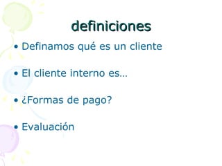 El documento define el cliente interno como cualquier persona u área dentro de una organización que depende de otra para realizar su trabajo. Explica que el enfoque en el cliente interno, propuesto por Karl Albrecht, invierte la pirámide organizacional poniendo al cliente externo en la cima y empoderando a los empleados de primer nivel. También destaca la importancia de la concientización, comunicación, empoderamiento y trabajo en equipo para mejorar el servicio al cliente interno y, en última instancia, al cliente externo.