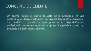 Este documento define conceptos clave como cliente, servicio y comunicación. Explica que un cliente es cualquier persona que utiliza los productos o servicios de una empresa de manera frecuente u ocasional. Define además clientes internos como empleados y clientes externos como quienes proporcionan ingresos a la empresa. Finalmente, detalla diferentes canales para atender requerimientos de clientes e indica claves para el primer encuentro como estar presente, cuidar la apariencia y sonreír.