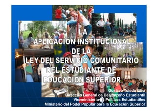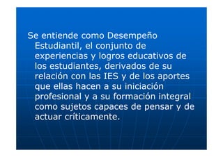 El documento aborda el desempeño estudiantil y el concepto de servicio comunitario en Venezuela, destacando su importancia en la formación integral del estudiante de educación superior. Se establece que el servicio comunitario permite a los estudiantes aplicar sus conocimientos en beneficio de la comunidad, siendo una nueva experiencia de aprendizaje que busca fomentar la participación activa y crítica del estudiante. Además, se menciona la necesidad de que las instituciones de educación superior diseñen reglamentos y proyectos que puedan integrarse a esta labor social, garantizando la colaboración con la comunidad beneficiaria.