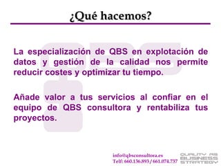 La consultora QBS ofrece servicios de análisis estadístico, recopilación de datos y mejora de sistemas de garantía de calidad para reducir costes y optimizar el tiempo de otras consultoras. QBS realiza análisis avanzados de información, diseña metodologías y modelos estadísticos, y se encarga de recopilar y procesar datos de campo para estudios. Esto permite a otras consultoras ahorrar recursos y mejorar sus resultados y satisfacción de clientes de manera rentable.