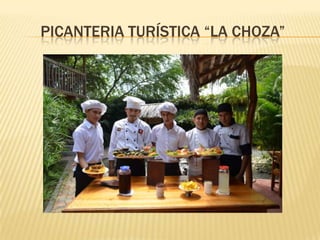 La picantería turística "La Choza" ofrece una variedad de platillos típicos peruanos como ceviches, pescados, chicharrones y platos típicos en un ambiente natural. Se diferencia de la competencia por su ubicación, buen servicio y variedad de platillos. Brinda calidad en cada plato, un buen producto y servicio rápido para satisfacer a los clientes.