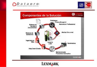 El documento presenta la propuesta técnica de Datapro S.A. para proveer servicios de impresión a Generalmotors-Omnibus BB durante 36 meses utilizando diversos modelos de impresoras láser Lexmark. Se detallan 19 ubicaciones donde se recomienda instalar las impresoras según el número de usuarios y volumen de impresión esperado en cada área.