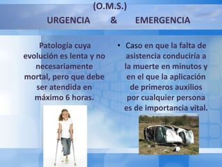 Este documento describe los criterios y requisitos para el funcionamiento de los servicios de urgencias pediátricas. Se clasifican los servicios en tres niveles dependiendo de sus recursos, y se especifica el personal y equipamiento mínimo requerido para cada nivel. También se definen conceptos como urgencia real frente a urgencia sentida, y se explica el proceso de triage para evaluar y clasificar a los pacientes dependiendo de su gravedad y prioridad de atención. Las patologías más frecuentes en pediatría que requieren atención de urgencias son