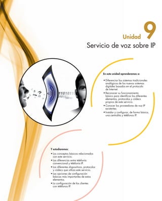 Este documento describe los conceptos básicos de la telefonía por voz sobre IP (VoIP). Explica las diferencias entre la telefonía convencional y la telefonía IP, así como los elementos clave de VoIP como los adaptadores telefónicos analógicos IP, los teléfonos IP, y las centralitas IP. También analiza cuestiones como la calidad de servicio en redes VoIP y los desafíos técnicos asociados con la transmisión de voz a través de Internet.