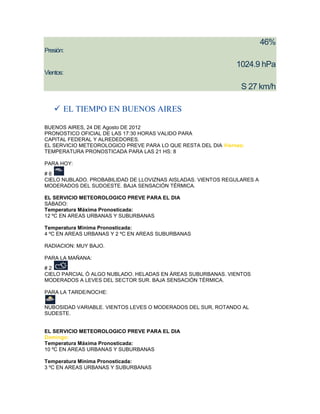 El documento proporciona información meteorológica para las ciudades de Salta, Santa Fe y Buenos Aires en Argentina. Reporta las temperaturas, nubosidad, humedad, presión y vientos registrados, así como pronósticos del tiempo para los próximos días que incluyen temperaturas máximas y mínimas esperadas, nubosidad y dirección de los vientos.