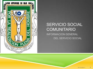 El documento proporciona información general sobre el servicio social comunitario en la UABC. Explica que los estudiantes deben asistir a un taller de inducción y registrarse en un programa de servicio social. También describe dónde se puede prestar el servicio social, el proceso para iniciarlo en línea, y los procedimientos para liberar el servicio social o darse de baja del programa seleccionado. Además, indica a quién acudir para resolver dudas sobre los trámites.