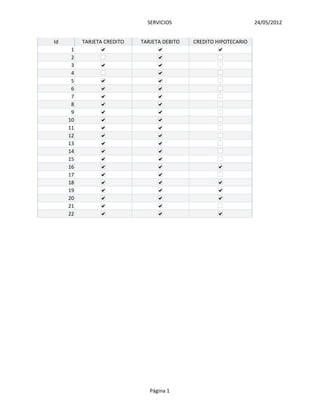 Este documento contiene tres páginas con información sobre diferentes servicios bancarios como tarjetas de crédito, débito, chequeras y créditos para diferentes clientes identificados por números de cuenta.