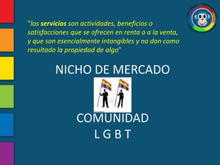 Este documento describe el mercado meta para servicios dirigidos a la comunidad LGBT. Identifica que el mercado meta generalmente incluye personas de esta comunidad que viven en el centro de la ciudad. Especifica que el mercado meta incluye parejas establecidas del mismo sexo de 35 a 60 años y solteros de 18 a 30 años. Además, describe que el nivel socioeconómico del mercado meta es alto, medio alto y medio, y que su estilo de vida se caracteriza por ser apasionados con el orden, la moda y la vanidad, con tendencia al