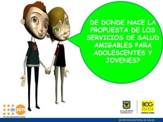 Este documento describe los servicios de salud amigables para adolescentes y jóvenes. Explica que estos servicios deben brindar acceso oportuno y de calidad, contar con personal capacitado que escuche y respete los derechos de los jóvenes, y ofrecer una amplia gama de servicios de manera confidencial. También señala que las instituciones de salud deben convertirse en espacios construidos con la participación de los jóvenes para brindar información y orientación que respete sus realidades.
