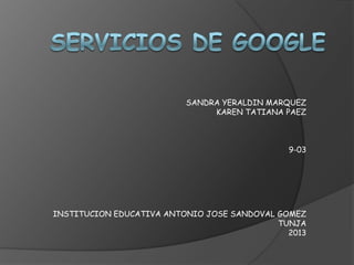 Este documento proporciona una breve descripción de los principales productos y servicios de Google, incluyendo el buscador de Google, Google Grupos, Google Noticias, Blogger, Google Libros, Gmail, Google Maps, Google Earth, Hangouts, Google Drive, Picasa, Google Calendar, YouTube, Google Chrome, Google Plus y Google Play.