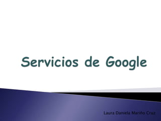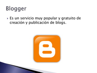 El documento describe varios servicios populares de Google como Blogger para crear blogs, Google Search para buscar productos, Gmail para correo electrónico, AdSense para publicidad contextual, AdWords para anuncios pagados, Google Alerts para notificaciones por correo, YouTube para compartir videos, Google Drive para almacenamiento en la nube, Google Maps para mapas interactivos, Google Photos para organizar fotos y Google Books para buscar texto completo en libros digitalizados.