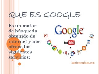 Google ofrece varios servicios populares como Gmail (correo electrónico), YouTube (videos), Blogger (blogs), Google Maps (mapas), Google News (noticias), Google Books (libros), Google Docs (documentos en la nube), Google Drive (almacenamiento en la nube), Google Traductor (traducciones) y su motor de búsqueda web principal.