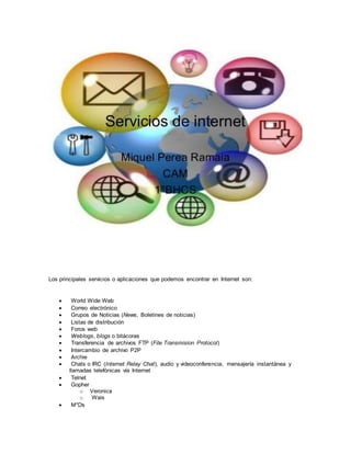 Los principales servicios de Internet incluyen el correo electrónico, grupos de noticias, transferencia de archivos, y la World Wide Web. Las redes sociales también se han vuelto muy populares, permitiendo a los usuarios conectarse y compartir información.