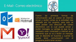 Los servicios de internet incluyen la web, correo electrónico, foros de discusión, transferencia de archivos, chats e IRC. Estos servicios permiten a los usuarios acceder a información, comunicarse y compartir archivos de forma remota. El correo electrónico y los foros de discusión son populares para comunicación, mientras que la transferencia de archivos y chats/IRC son útiles para compartir archivos e interactuar en tiempo real.