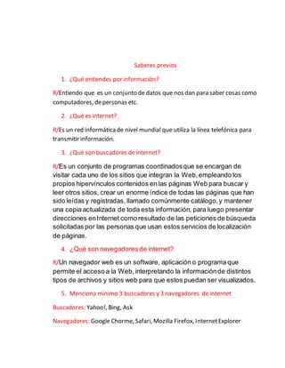 El documento presenta las respuestas de un estudiante a 10 preguntas sobre conceptos básicos de internet y la web. El estudiante define información, internet, buscadores y navegadores de internet. Menciona ejemplos comunes de cada uno y servicios como redes sociales, correo electrónico y chat. También explica la diferencia entre una página web y correo electrónico, y define conceptos como blog y Web 2.0.