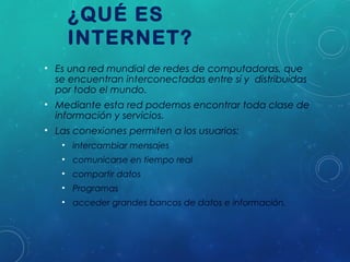 Este documento describe lo que es Internet, su historia y los principales servicios que ofrece. Internet es una red mundial de redes de computadoras interconectadas que permite el intercambio de información, mensajes y datos. Se originó en 1969 como el proyecto ARPANET del Departamento de Defensa de EE.UU. para crear una red robusta. En la actualidad, es una colección de redes privadas y públicas que ofrece servicios como correo electrónico, web, chat y acceso a información.