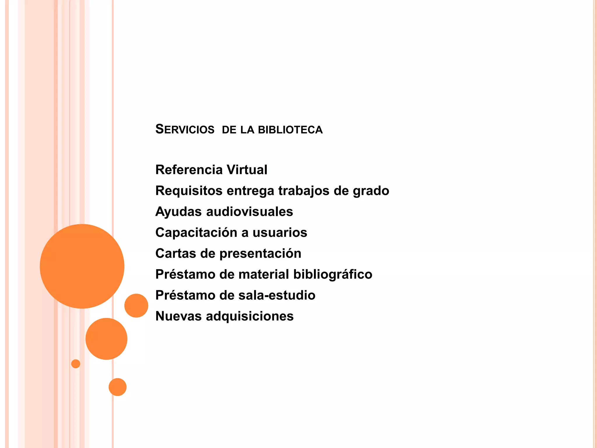 La biblioteca ofrece varios servicios como referencia virtual, requisitos para trabajos de grado, capacitación a usuarios, préstamo de material bibliográfico y sala de estudio. Los usuarios pueden acceder a recursos de referencia a través de chat, correo electrónico o teléfono. La biblioteca también mantiene tesis digitales y ofrece cursos de capacitación para el uso efectivo de la información.