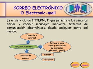 El correo electrónico es un servicio de internet que permite enviar y recibir mensajes de manera rápida y segura, a pesar del problema del spam. Además, se mencionan herramientas como el chat, Google Docs, blogs y redes sociales, que facilitan la comunicación y colaboración en línea. Las videoconferencias permiten encuentros interactivos entre personas en diferentes ubicaciones geográficas utilizando audio y video.