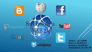 Este documento describe las características clave de la Web 2.0, incluyendo la facilitación del compartir información, la interoperabilidad, el diseño centrado en el usuario y la colaboración entre usuarios. Explica que los sitios Web 2.0 permiten a los usuarios interactuar y colaborar como creadores de contenido en una comunidad virtual, a diferencia de los sitios web estáticos. Además, resume algunas herramientas comunes de la Web 2.0 como blogs, wikis, redes sociales y entornos para compartir recursos.