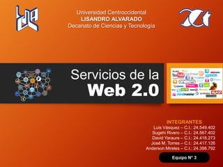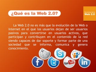 El documento describe varios servicios de la Web 2.0 como blogs, motores de búsqueda, agregadores, wikis, redes sociales, mundos virtuales, webtops y comunidades de contenido. Define cada uno de estos servicios y proporciona ejemplos. Además, analiza ventajas e inconvenientes del uso de webtops.