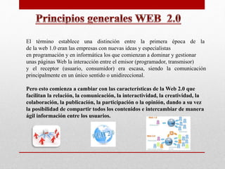 El documento describe la evolución de la Web 1.0 a la Web 2.0, la cual facilita una mayor interactividad y participación de los usuarios al compartir y crear contenido. También se mencionan algunas redes sociales importantes de la Web 2.0 como Facebook y YouTube. Explica que en la Web 2.0 los usuarios pasan de ser meros consumidores a creadores de contenido, y que esto apoya el aprendizaje colaborativo.