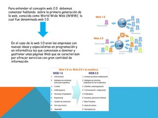 El documento describe los servicios de la Web 2.0, incluyendo blogs, motores de búsqueda, redes sociales, wikis y comunidades de contenido. Explica que la Web 2.0 facilita la relación, comunicación, interactividad, creatividad y colaboración entre usuarios, permitiéndoles compartir e intercambiar información de manera ágil.