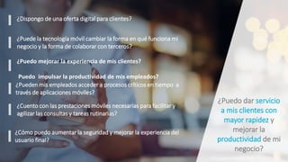 El documento presenta una oferta de servicios de movilidad de Viewnext, enfocándose en la aplicación y gestión de tecnologías móviles para mejorar la experiencia del cliente y optimizar la productividad empresarial. Describe la transformación del mercado de aplicaciones móviles, abordando las necesidades del consumidor digital e incluyendo soluciones para distintos sectores como banca, retail y utilities. Viewnext ofrece un modelo de servicios integrado que incluye diseño, desarrollo y validación de aplicaciones móviles, apoyado por un equipo especializado y una red de centros tecnológicos.
