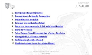 El documento presenta información sobre servicios de salud inclusivos y la certificación de establecimientos de salud en el Ecuador. Se describen 10 áreas temáticas sobre las que los establecimientos deben trabajar, como servicios inclusivos, determinantes de salud, derechos humanos y participación social. También se explica que la certificación busca fortalecer los enfoques de promoción de salud e incorporar determinantes sociales. Finalmente, se establecen tres niveles de certificación - inicial, satisfactorio y óptimo - en función
