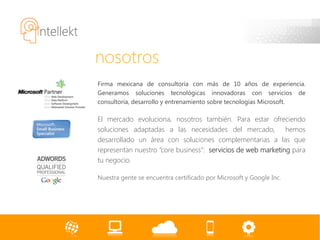 Este documento ofrece una descripción de los servicios de marketing web de una empresa mexicana de consultoría. La empresa ofrece servicios como email marketing, marketing en redes sociales, posicionamiento en buscadores, publicidad en línea, registro de dominios y hosting. El objetivo es ayudar a las empresas a resaltar de la competencia y cumplir sus objetivos de negocio a través de estrategias de marketing digital.