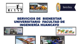 El documento detalla los servicios de bienestar universitario de la Facultad de Ingeniería de Huancayo, que incluyen atención médica, servicio social, apoyo psicopedagógico, actividades deportivas y culturales, y una biblioteca virtual. Estos servicios están diseñados para apoyar a estudiantes, docentes y personal administrativo en diversas áreas, desde salud hasta actividades extracurriculares. Se incluye información sobre horarios, ubicaciones y responsables de cada servicio ofrecido.