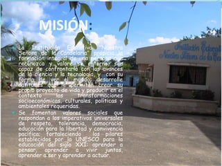 La institución educativa 'Nuestra Señora de la Candelaria' se dedica a la formación integral de estudiantes, promoviendo valores como el respeto y la tolerancia, y apoyándose en los pilares de la UNESCO para la educación del siglo XXI. Ofrece educación en todos los niveles, incluyendo preescolar y media técnica, y cuenta con infraestructura adecuada y recursos tecnológicos para el desarrollo pedagógico. Además, establece convenios con otras instituciones educativas para fomentar la superación y la investigación en su comunidad.