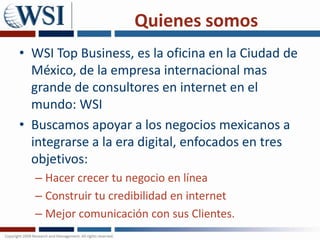 WSI Top Business ofrece servicios de consultoría en marketing por correo electrónico para ayudar a las empresas mexicanas a crecer en línea, incluyendo el diseño de plantillas de correo, programación de envíos, medición de métricas y soporte técnico a través de la plataforma Constant Contact. Los clientes reciben capacitación, activación de cuentas en Constant Contact y descuentos por prepago de hasta el 15% por doce meses.