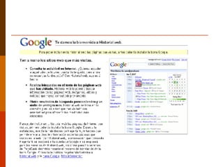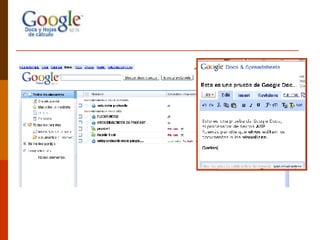 El documento resume brevemente varios servicios de Google como Google Photos, Google Docs, Google Calendar, Google Reader, Google Sites, Google Bookmarks y Google Talk. Menciona que Google Photos permite compartir fotos de forma gratuita, Google Docs permite agregar recortes de contenido web a notas, Google Calendar permite organizar calendarios individuales y grupales, y Google Mail ofrece casi 3 gigabytes de almacenamiento por cuenta.