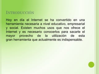 El documento describe los principales servicios que ofrece Internet, incluyendo servicios síncronos como el chat y la videoconferencia que permiten comunicación en tiempo real, y servicios asíncronos como el correo electrónico y los foros que permiten comunicación diferida. También explica en detalle algunos servicios específicos como el protocolo FTP para transferencia de archivos y el protocolo IRC para chat.