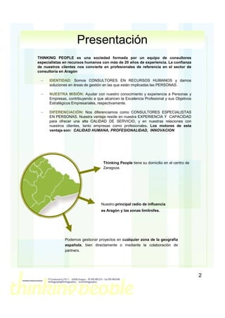 Thinking People es una consultora de recursos humanos con más de 20 años de experiencia en Aragón, especializada en seleccionar personal, formaciones corporativas y desarrollo organizacional. Ofrecen servicios personalizados en áreas como clima laboral, coaching, comunicación interna y diseño de planes de formación para optimizar la gestión del talento en empresas. Su enfoque se basa en la confianza y relaciones duraderas con los clientes, adaptando cada solución a las necesidades específicas de cada organización.