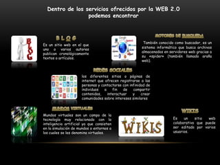 Este documento describe varios servicios y herramientas de la Web 2.0 como blogs, wikis, motores de búsqueda, mundos virtuales, redes sociales y agregadores de noticias. Explica brevemente qué son cada uno de estos servicios y cómo funcionan. También menciona que el software de oficina como Microsoft Office es uno de los más utilizados para tareas diarias.