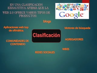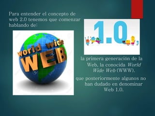 Este documento describe los servicios web 2.0 como Facebook, Twitter y Wikipedía, que facilitan la comunicación, colaboración e interacción entre usuarios. Explica cómo los motores de búsqueda, portales de noticias, espacios colaborativos, redes sociales y comunidades de contenido permiten compartir y editar información. Concluye que el internet y la web son herramientas muy útiles que deberían estar disponibles para todo el mundo.