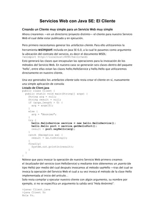 Este documento describe cómo crear un servicio web simple en Java utilizando JAX-WS y cómo crear un cliente para acceder a ese servicio web. Explica los pasos para implementar una clase de servicio web, generar los artefactos de despliegue, publicar el servicio utilizando un endpoint y probarlo localmente. También cubre cómo generar los artefactos del cliente, invocar los métodos del servicio web y probar la comunicación entre el cliente y el servicio.